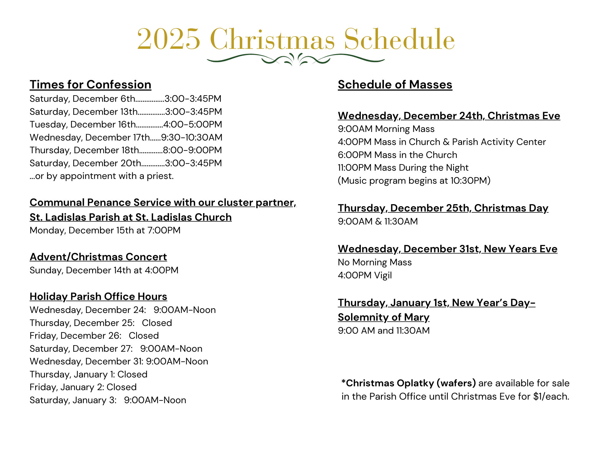 Please call or stop in the Parish Office to obtain additional information about specific groups or services that are of interest to you, or should you need any information or assistance. We hope and pray that you will find a home here and will become actively involved in parish life.